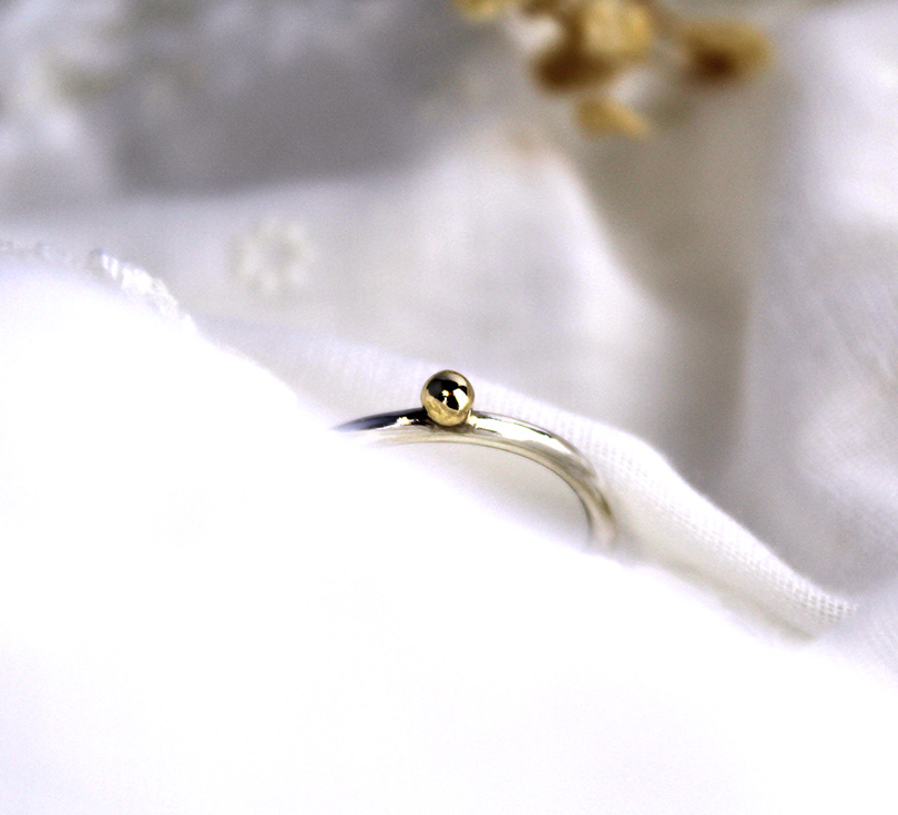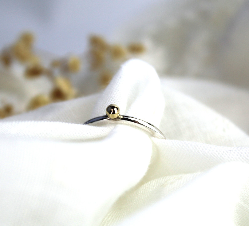 Minimalistische zilveren ring met gouden bol. Tijdloze elegantie, luxe uitstraling, perfect voor dagelijks gebruik of als stijlvolle stapelring. Deze ring is handgemaakt uit een mix van fijn zilver en 14 karaat goud.